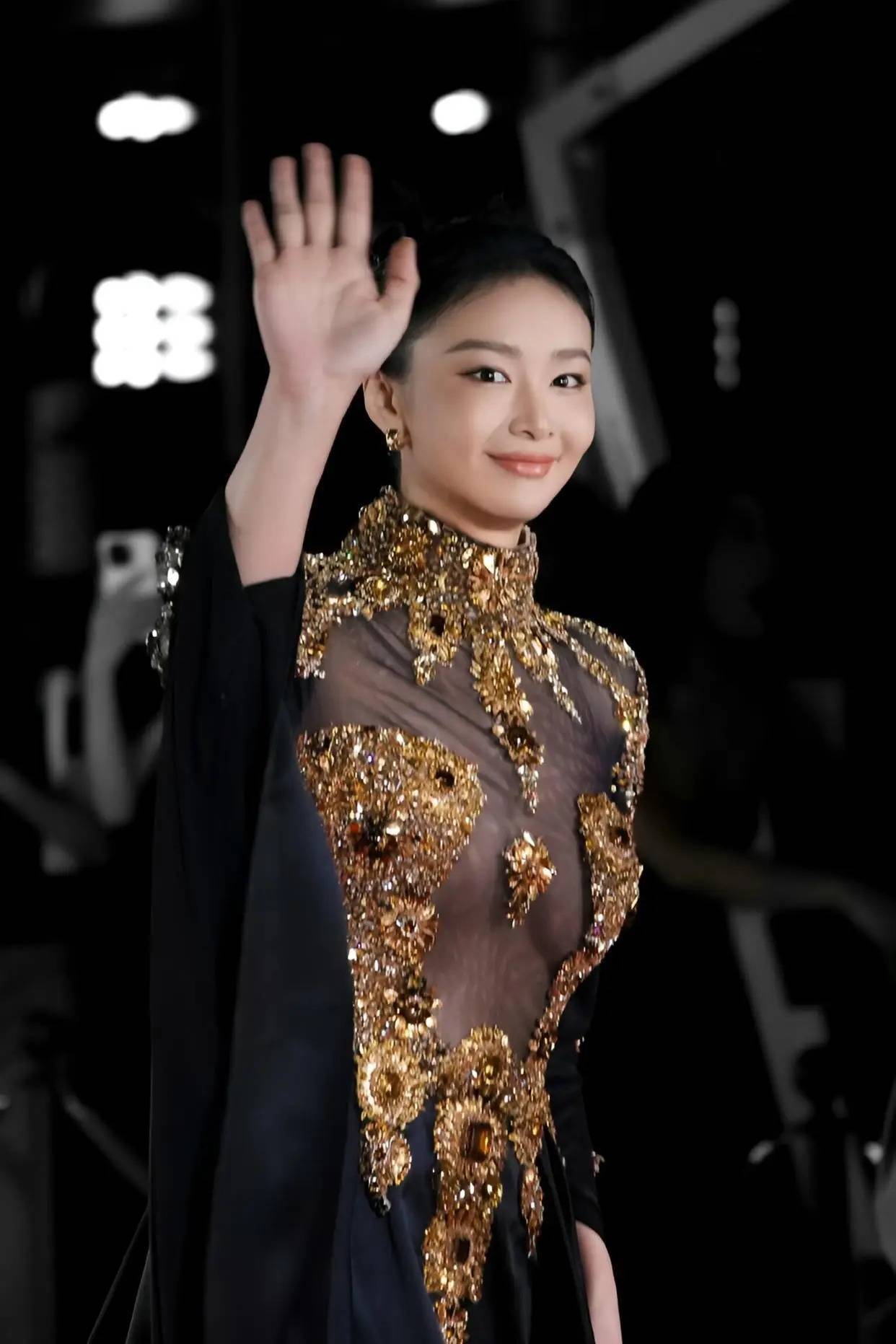 这条鎏金裙采用了华丽的钉珠与宝石装饰工艺,在灯光的照射下,闪烁着耀眼的光芒,仿佛一件行走的艺术品。上身的透视(sheer)设计,大胆又不失优雅,将高叶的身材优势尽情展现,让她看起来既有女性的柔美,又带着一股 “不好惹” 的飒爽劲儿,完美契合了大家对 “大嫂” 的印象,仿佛她就是从电视剧里走出来的 “陈书婷”,气场全开。